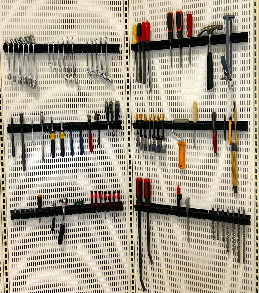 Vid montering på vägg är det inga konstigheter. Den formbara plasten tas bort som vanligt, och hållaren skruvas fast på valfri yta genom de angivna hålen. Det är verkligen så enkelt som förvaring av verktyg och redskap kan bli.