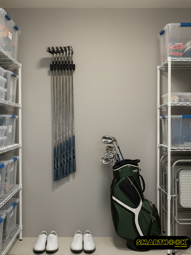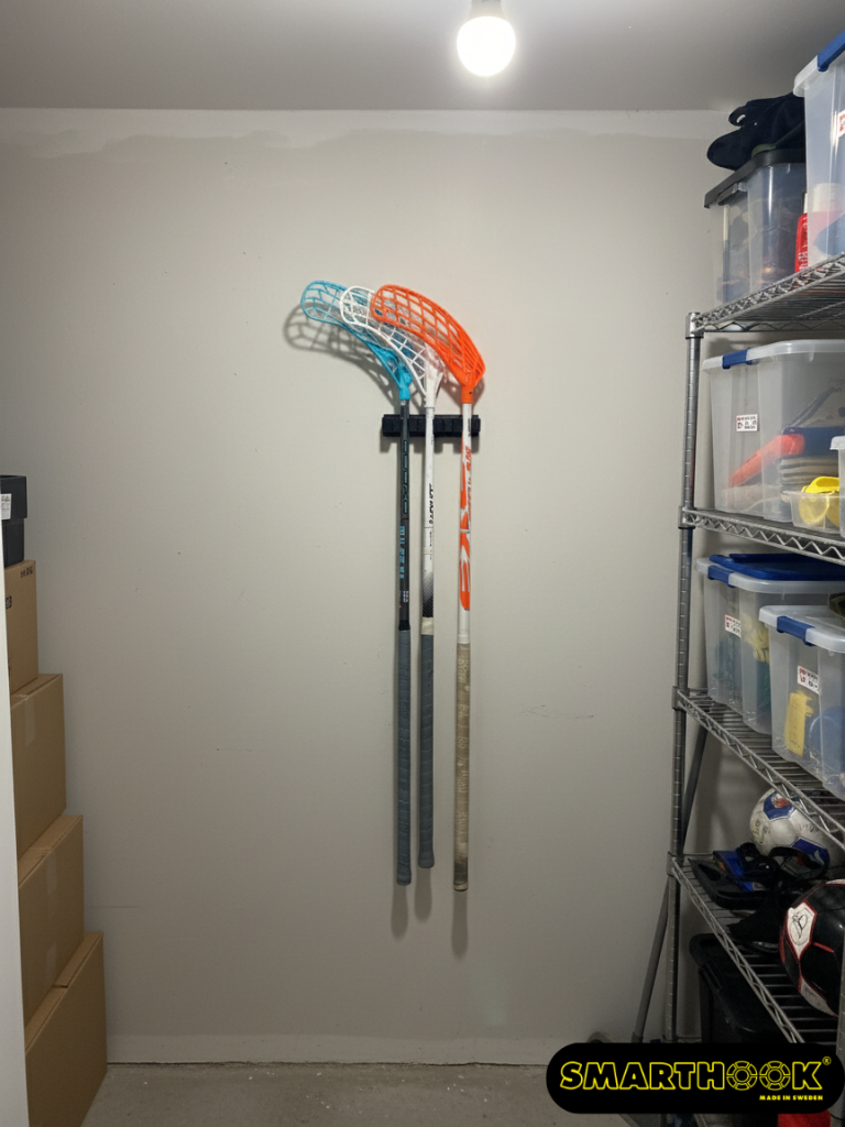 SmartHook passar till en mängd olika sporttillbehör och kan bli en huvudspelare i ditt förråd genom att frigöra plats för annat. Som du ser på bilderna nedan går det utmärkt att hänga upp innebandy- och golfklubbor på ett snyggt och ordnat sätt, men vad du väljer att hänga upp sätter bara du gränsen för.