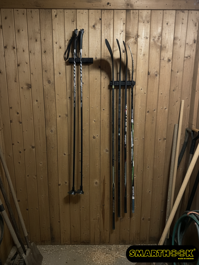 Men SmartHook fungerar förstås till mycket mer, till exempel för hockeyklubborna som alltid ligger på fel plats, eller stavar som tenderar att försvinna. En enkel lösning för ordning bland alla dina vintersportprylar.